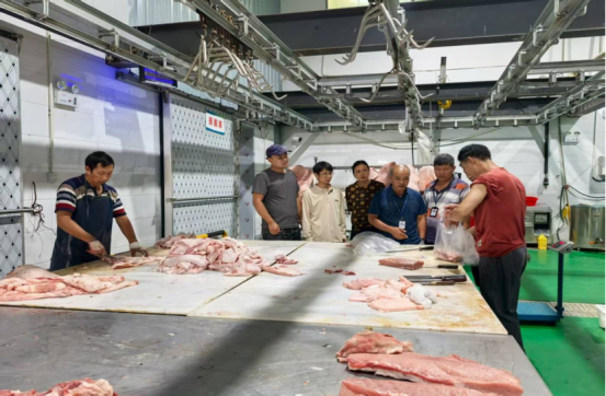 工作人员在屠宰场对猪肉开展抽样